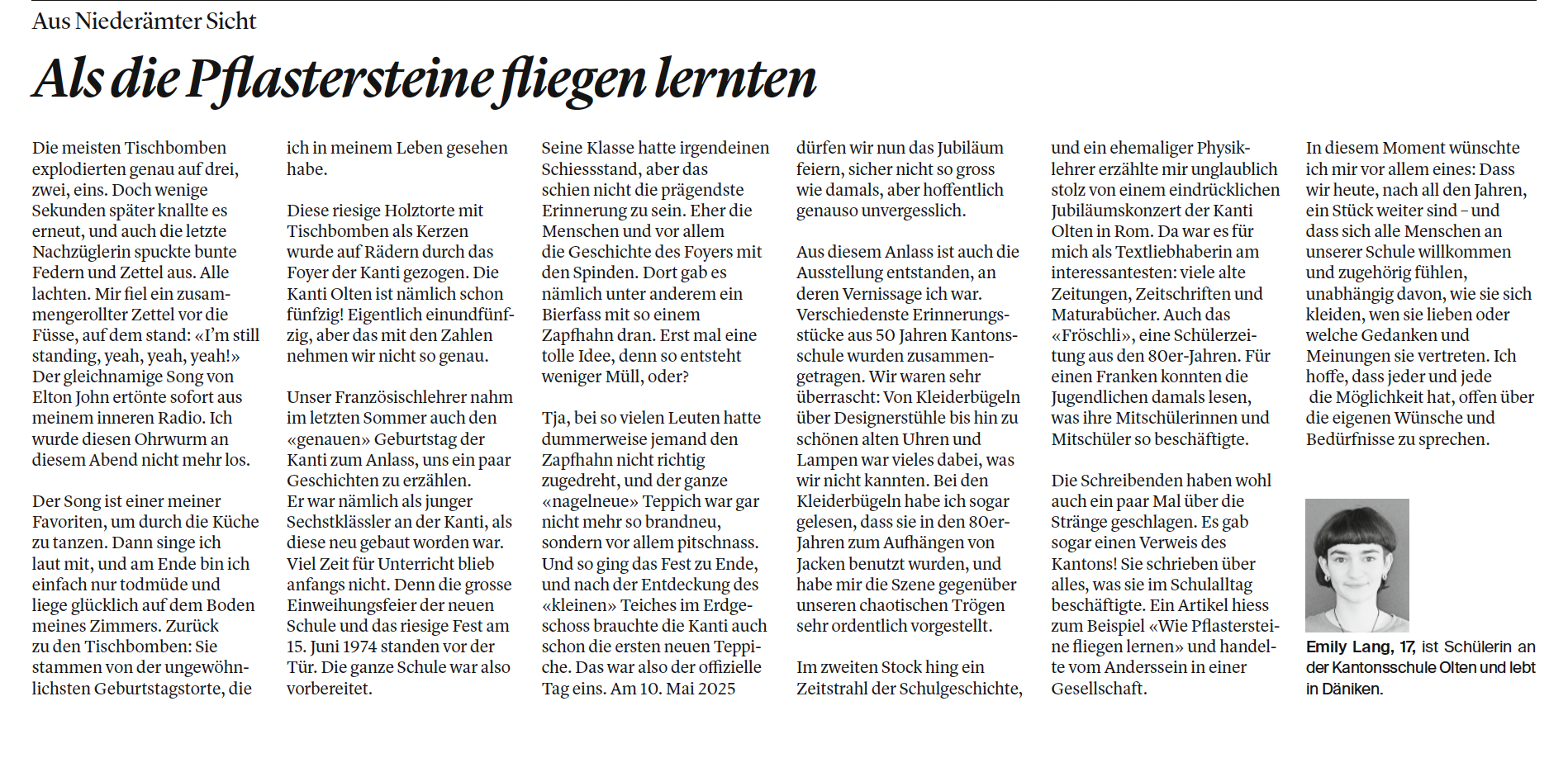 Im zweiten Stock hing ein Zeitstrahl der Schulgeschichte, und ein ehemaliger Physik- lehrer erzählte mir unglaublich stolz von einem eindrücklichen Jubiläumskonzert der Kanti Olten in Rom. Da war es für mich als Textliebhaberin am interessantesten: viele alte Zeitungen, Zeitschriften und Maturabücher. Auch das «Fröschli», eine Schülerzeitung aus den 80er-Jahren. Für einen Franken konnten die Jugendlichen damals lesen, was ihre Mitschülerinnen und Mitschüler so beschäftigte.